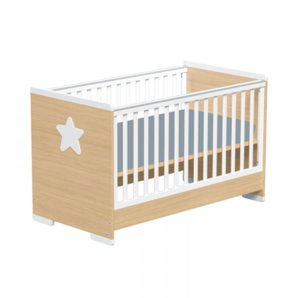 Σετ βρεφικού δωματίου Primo, που περιλαμβάνει κούνια και συρταρίερα, κατασκευασμένα από μασίφ ξύλο οξιάς και υψηλής ποιότητας μελαμίνη σε χρώμα φυσικό.