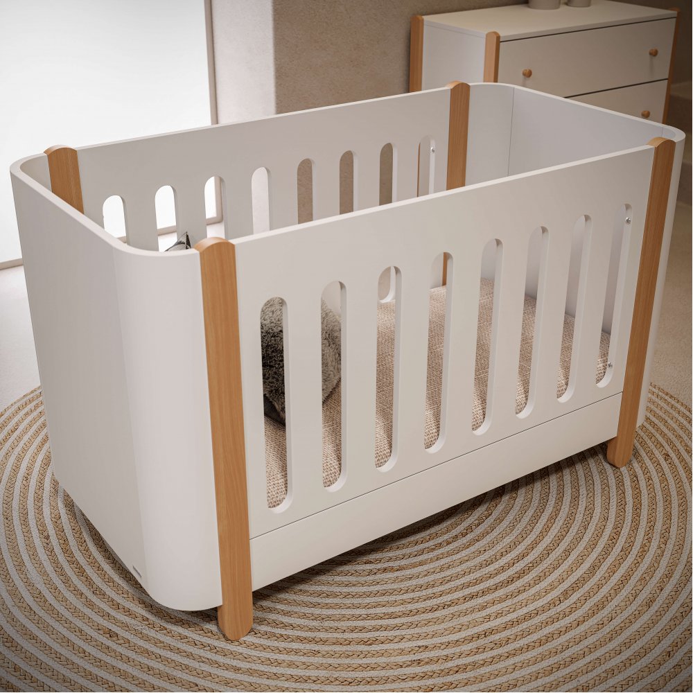 The Reine baby cot features five stages of conversion and is designed to grow along with your child. It starts as a cradle (conversion kit is included) and later transforms into a standard baby cot and toddler bed.The cot base is orthopedic, made of 100% solid beech wood, offering reinforced mattress support and maximum sleeping comfort. The mattress height is adjustable in two positions, suitable for 0–6 months and 6+ months, ensuring optimal baby safety and greater convenience for the parent. The cot also includes a custom-fitted plastic rail protector to protect the baby during teething.